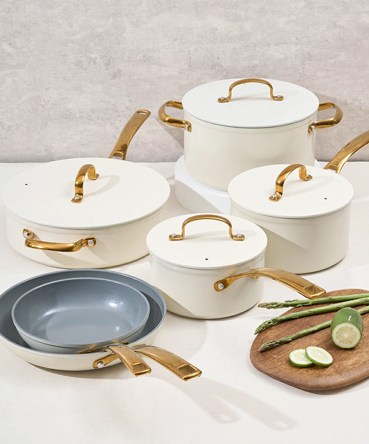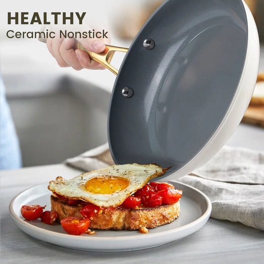 The light golden handles are comfortable, and the non-stick ceramic cookware set really delivers. Eggs, pancakes, and sauces slide out effortlessly. The set feels premium and looks beautiful on my stove.