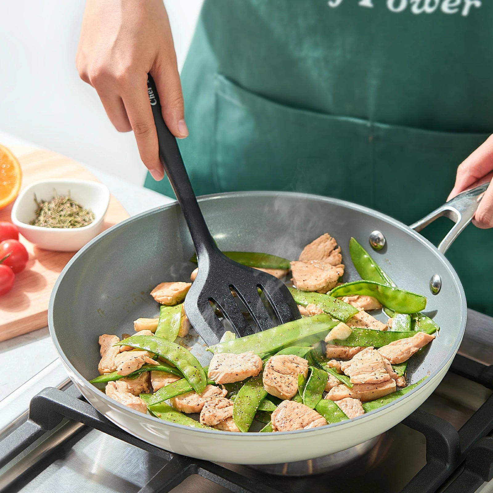 Cook, bake, boil, sauté and more are all covered by the 10-piece set, made from high-quality aluminum and coated in non-toxic, non-stick ceramic, free of PFAS, PTFE, Lead, or Cadmium.