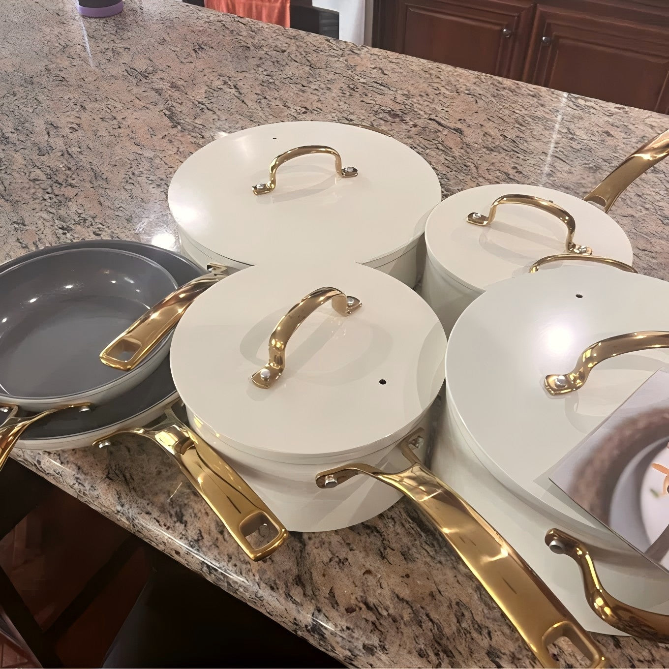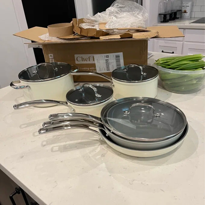 These pots and pans are good quality, non stick pans. I like that they are easy to clean and not super heavy. The set comes with a variety of sizes for all my cooking needs. The pan lids fit nicely and the steam escapes a hole in the top.