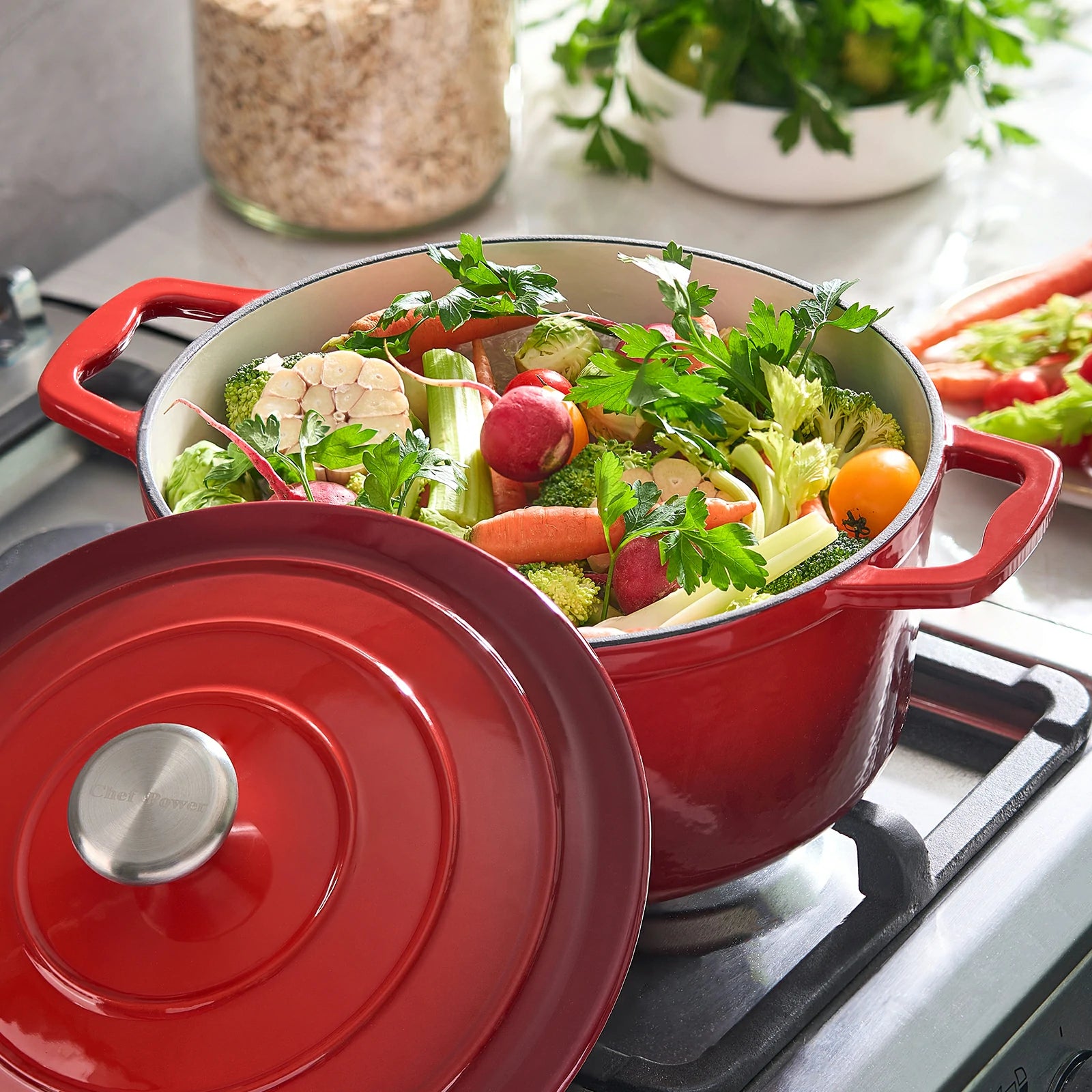 The Chef Power 5QT Dutch Oven is designed to be your most reliable kitchen partner. It masterfully combines the exceptional heat retention of cast iron with a smooth, non-toxic enamel coating, freeing you from the worry of harmful PFAS, PFOA, and PTFE chemicals. It's the perfect vessel for creating deep-flavored braised meats, crusty no-knead bread, and hearty soups that taste like they've been simmering for days. From your stovetop to the oven, and then straight to the table, its elegant design makes every meal a special occasion. We believe in creating cookware that is built to perform, safe for your family, and makes everyday cooking a more joyful experience.