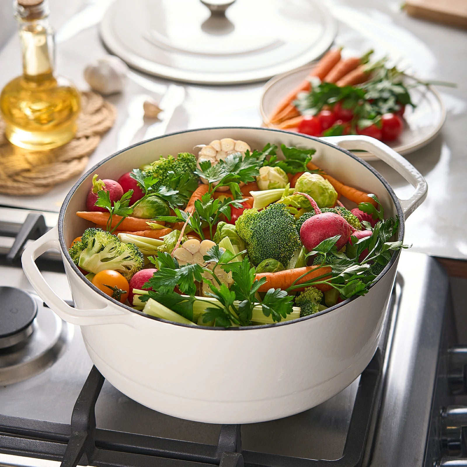 Perfect home cooking with our 6QT enameled cast iron Dutch oven for healthy braising, stews, roasting, bread baking, it offers steady heat on all stovetops with ample capacity.