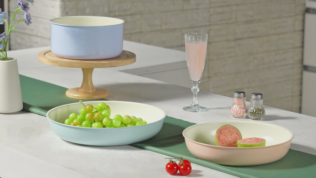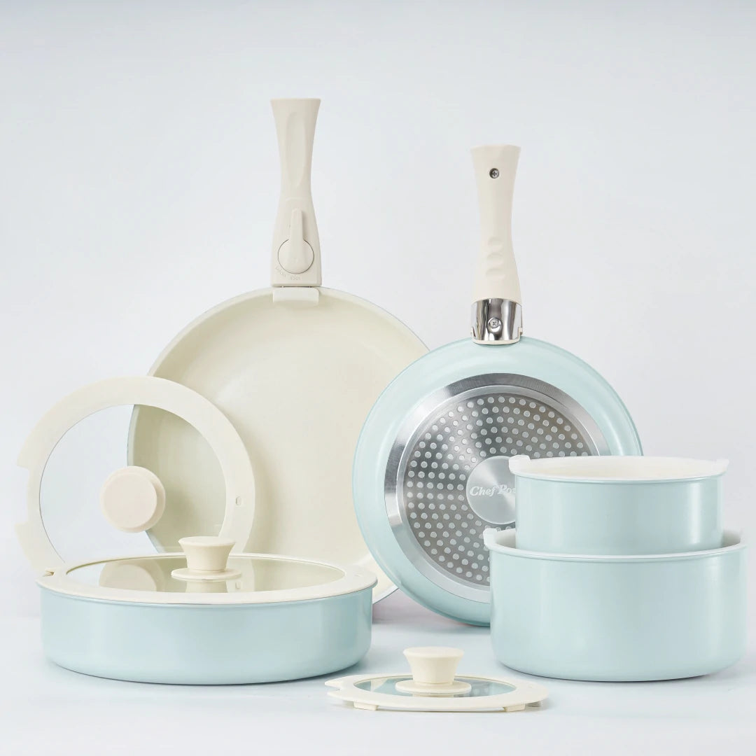 Tired of cluttered cabinets and chemical concerns? This vibrant ceramic cookware set is the ultimate solution for healthy, convenient cooking in the modern kitchen, RV, or campsite. Featuring naturally non-stick, toxin-free ceramic coating and revolutionary removable handles.