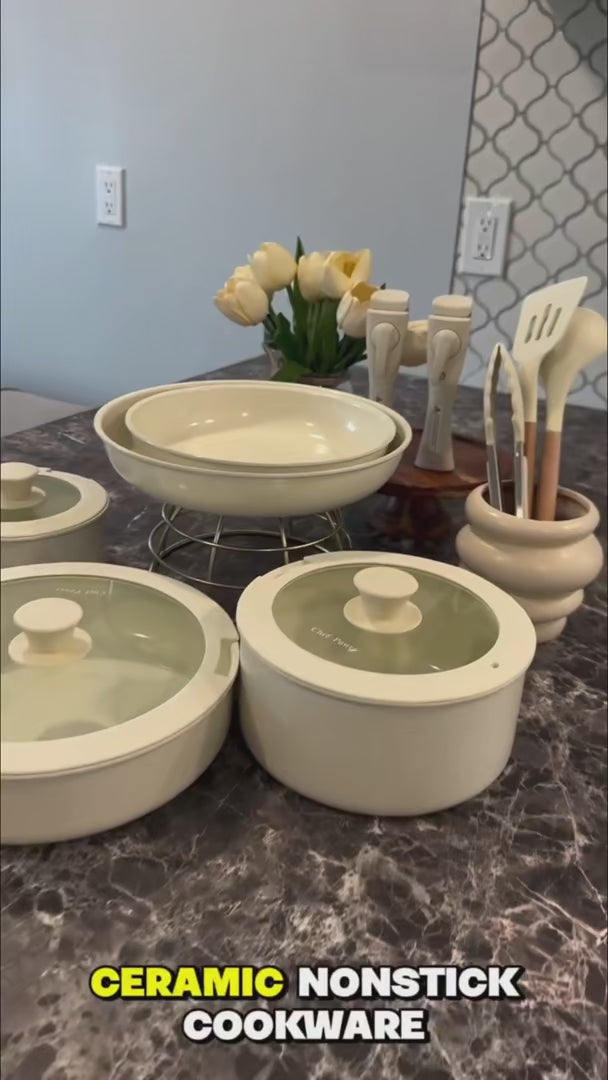Picked up this non toxic ceramic cookware set for my apartment and honestly didnt expect to like it this much. The pans heat evenly and food slides right off with very little oil. The removable handle feels solid when cooking and pops off fast for storage. I cook almost daily and this set just makes things easier. Solid quality for the price.