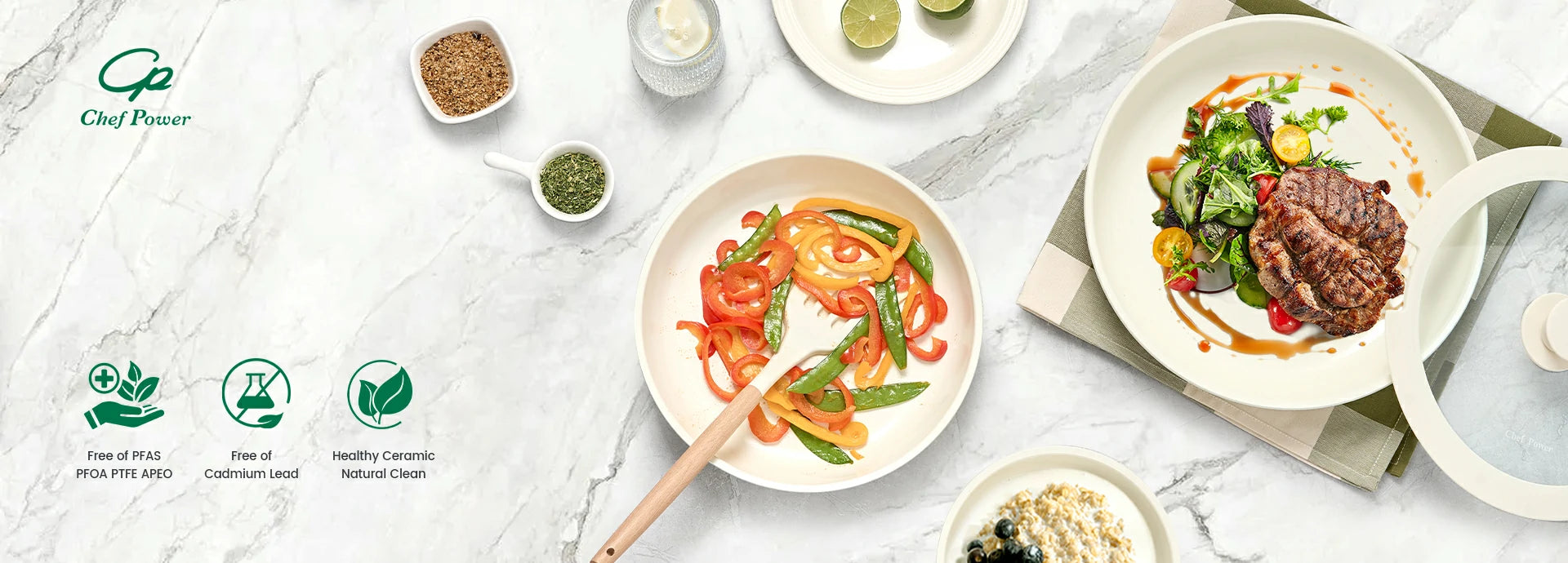 - Healthy Ceramic Coating: Chef Power's ceramic coating is derived from natural rocks, not synthetic chemicals. It is free from PFAS, PFOA, PTFE, PFOS, Teflon, lead, and cadmium. Cook with absolute peace of mind, every time.