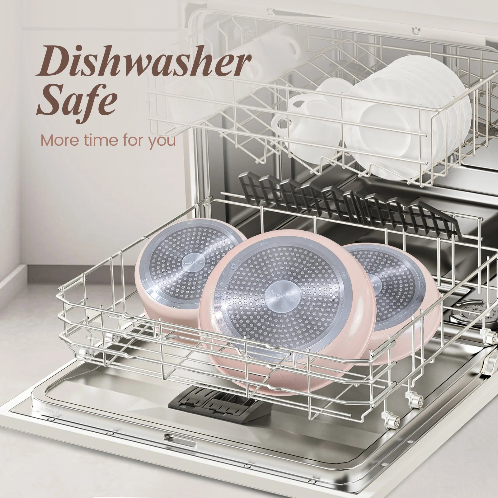 While our ceramic cookware is generally dishwasher safe, we recommend hand washing to best preserve the integrity of the non-stick coating and extend the lifespan of your pots and pans.