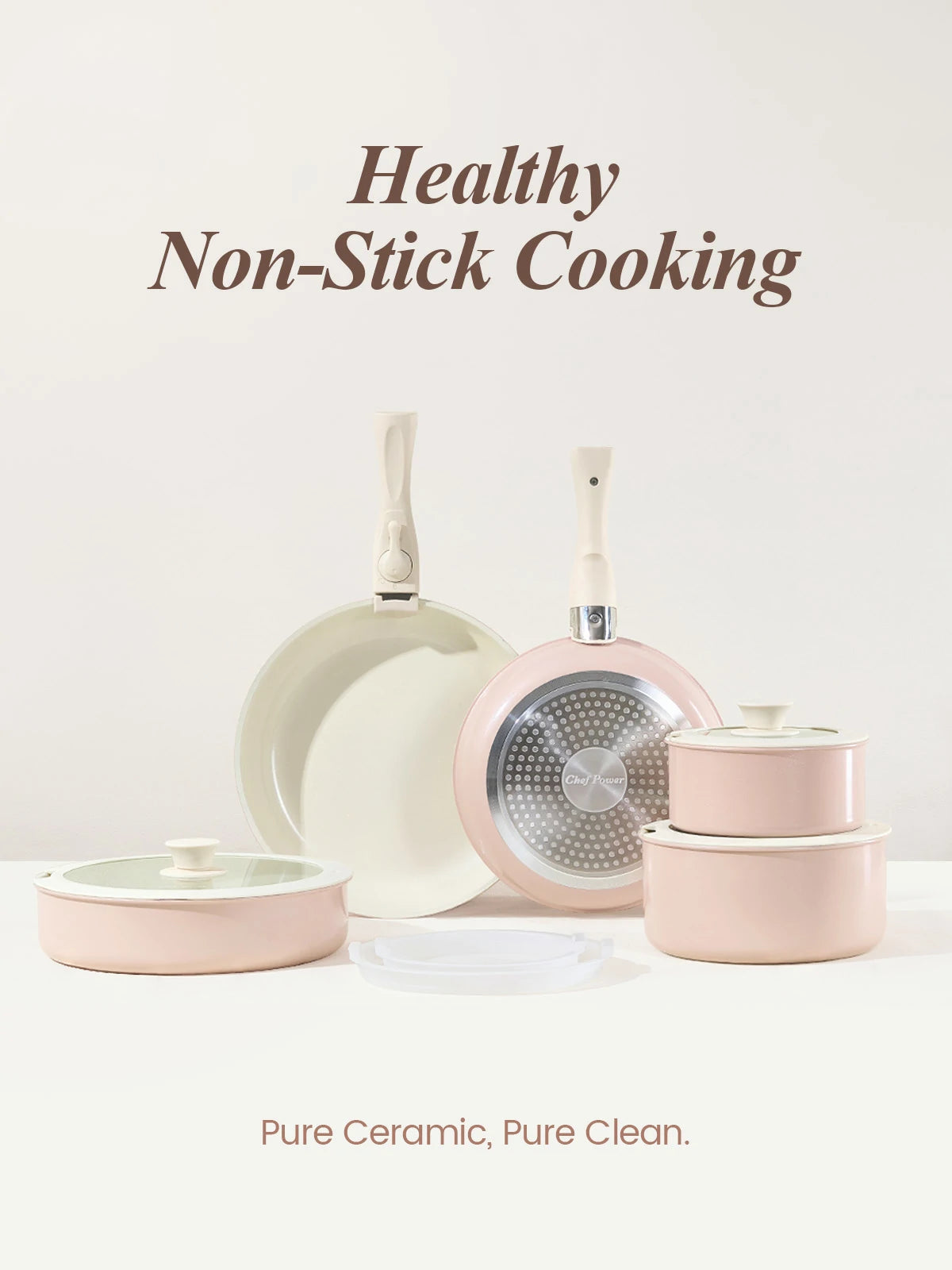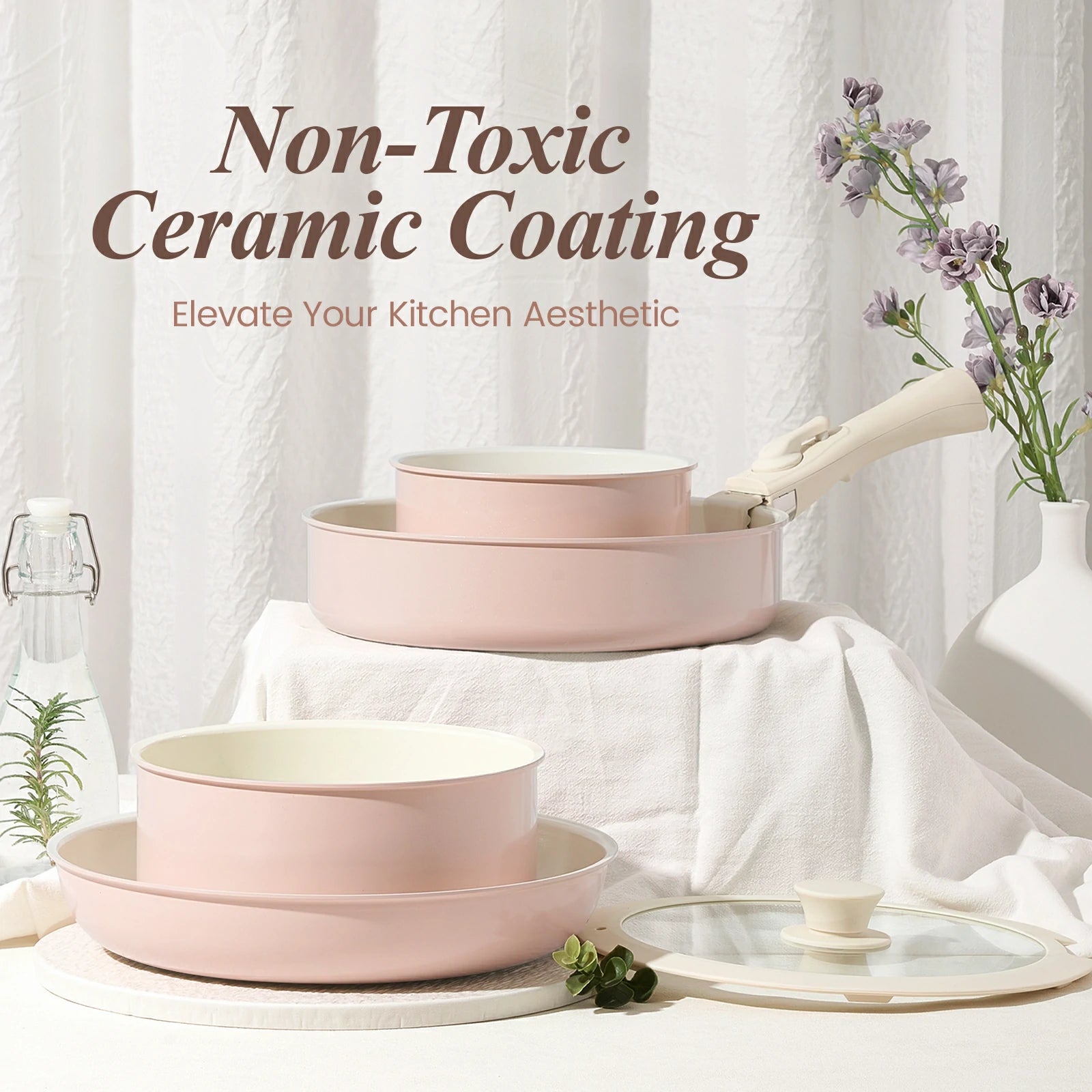 Tired of cluttered cabinets and chemical concerns? This vibrant ceramic cookware set is the ultimate solution for healthy, convenient cooking in the modern kitchen, RV, or campsite. Featuring naturally non-stick, toxin-free ceramic coating and revolutionary removable handles.