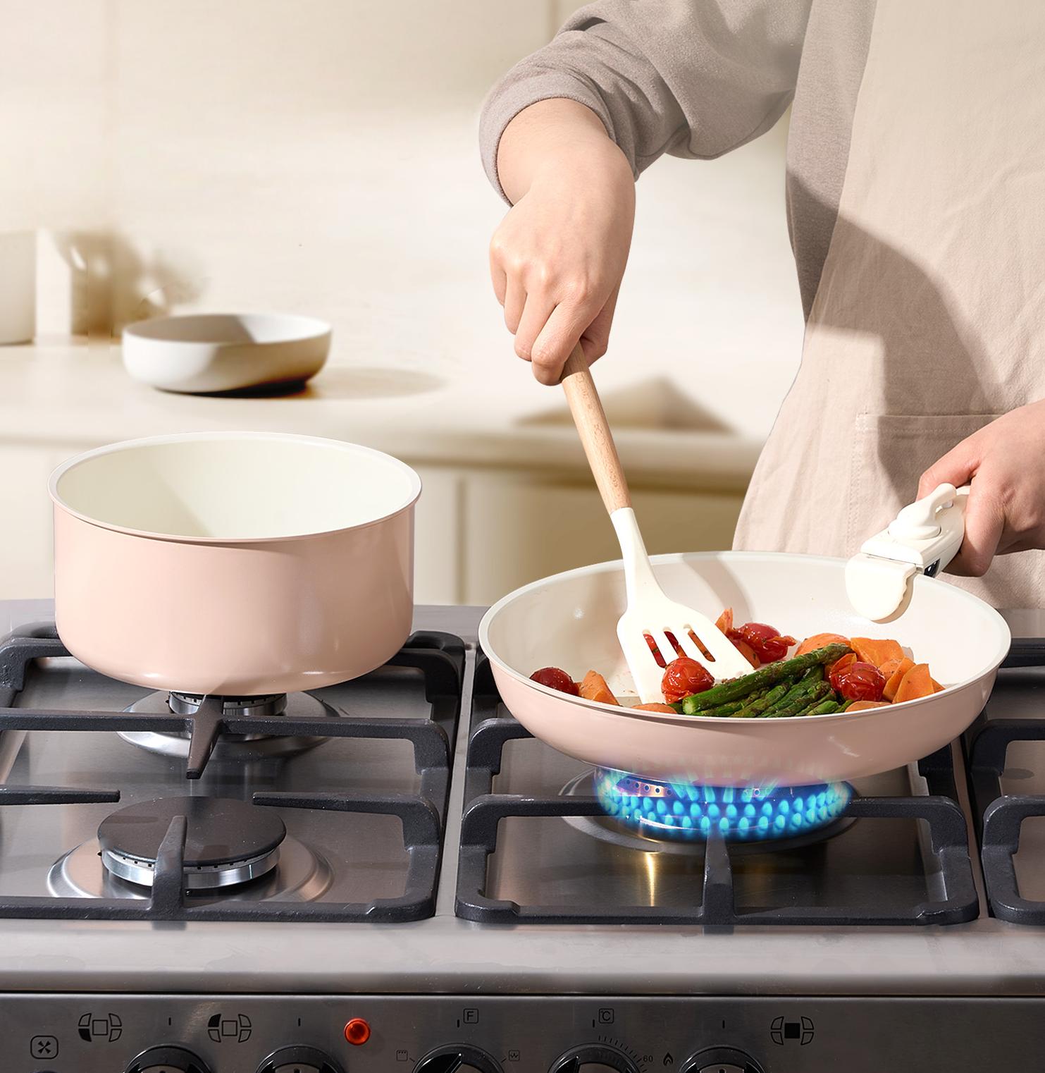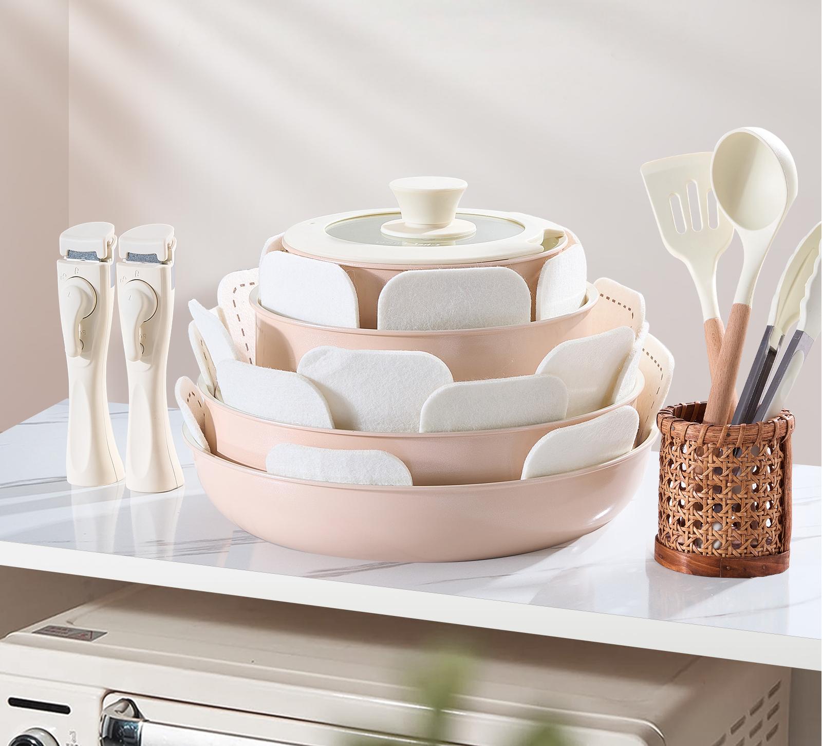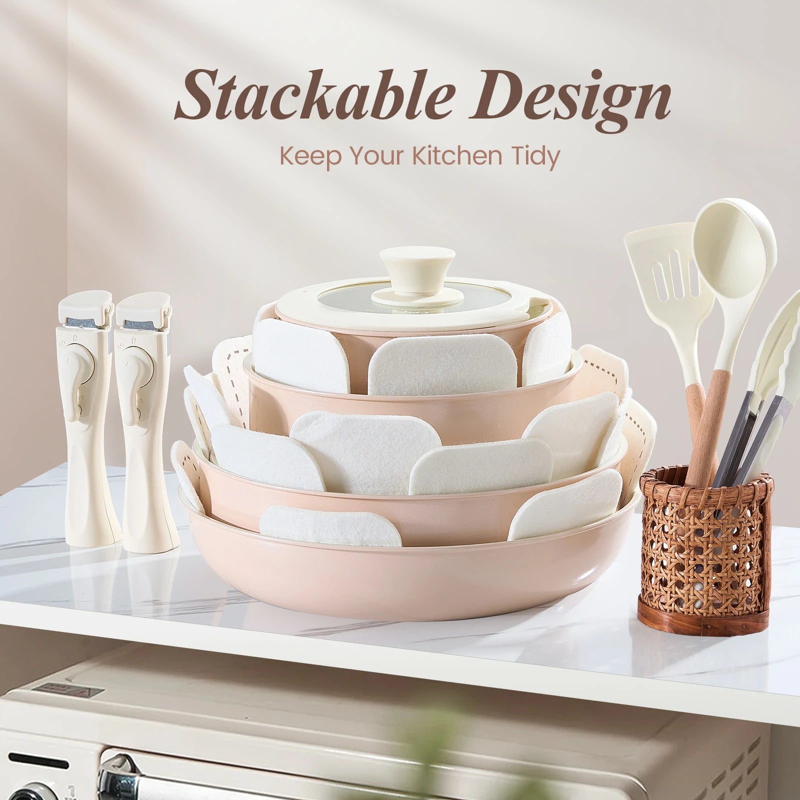 A Truly Complete Kitchen Set: Includes saucepans, stockpots, frying pans, silicone lids, sealing lids, detachable handles, silicone utensils, and pot protectors. You no longer need to buy additional utensils suitable for ceramic pans. The matching pot mats prevent scratches caused by stacking pots, and the two detachable handles are enough for your daily cooking.