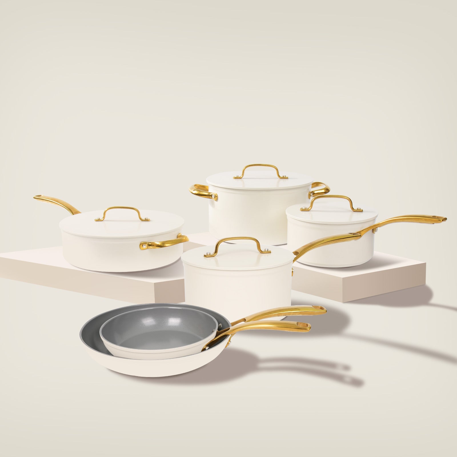 Too beautiful to hide in the cabinet. With its chic white body and golden accents, this set transitions seamlessly from the stovetop to your dining table, making every meal feel like a special occasion.