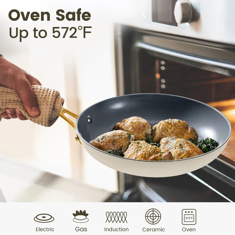 This ceramic cookware set combines everyday convenience with a modern touch. The golden handles offer a stylish yet comfortable grip, while the versatile range of pots and pans makes it easy to prepare anything from quick breakfasts to family dinners. It’s a practical upgrade from traditional cookware for everyday home cooking.