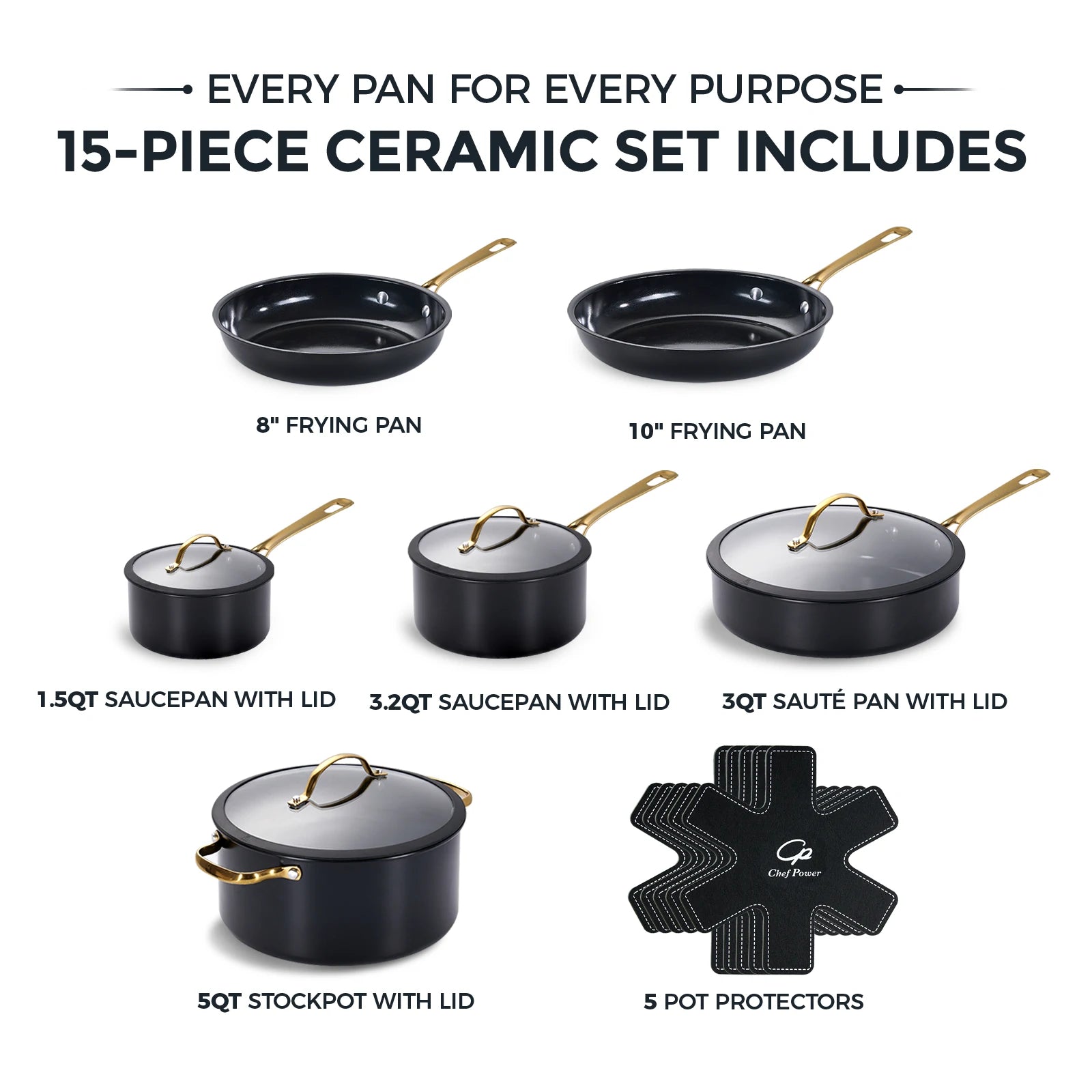 Stars Ceramic Nonstick 15-Piece Cookware Set with Light Golden Handles | Black