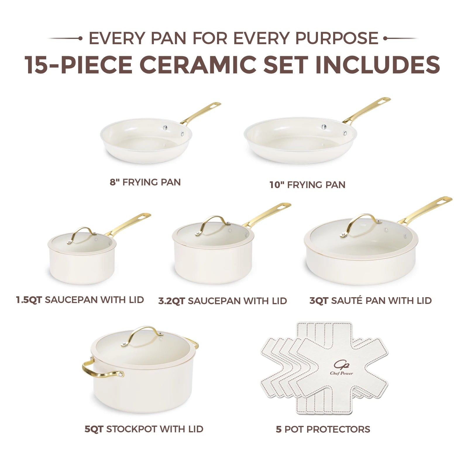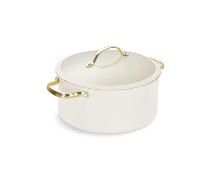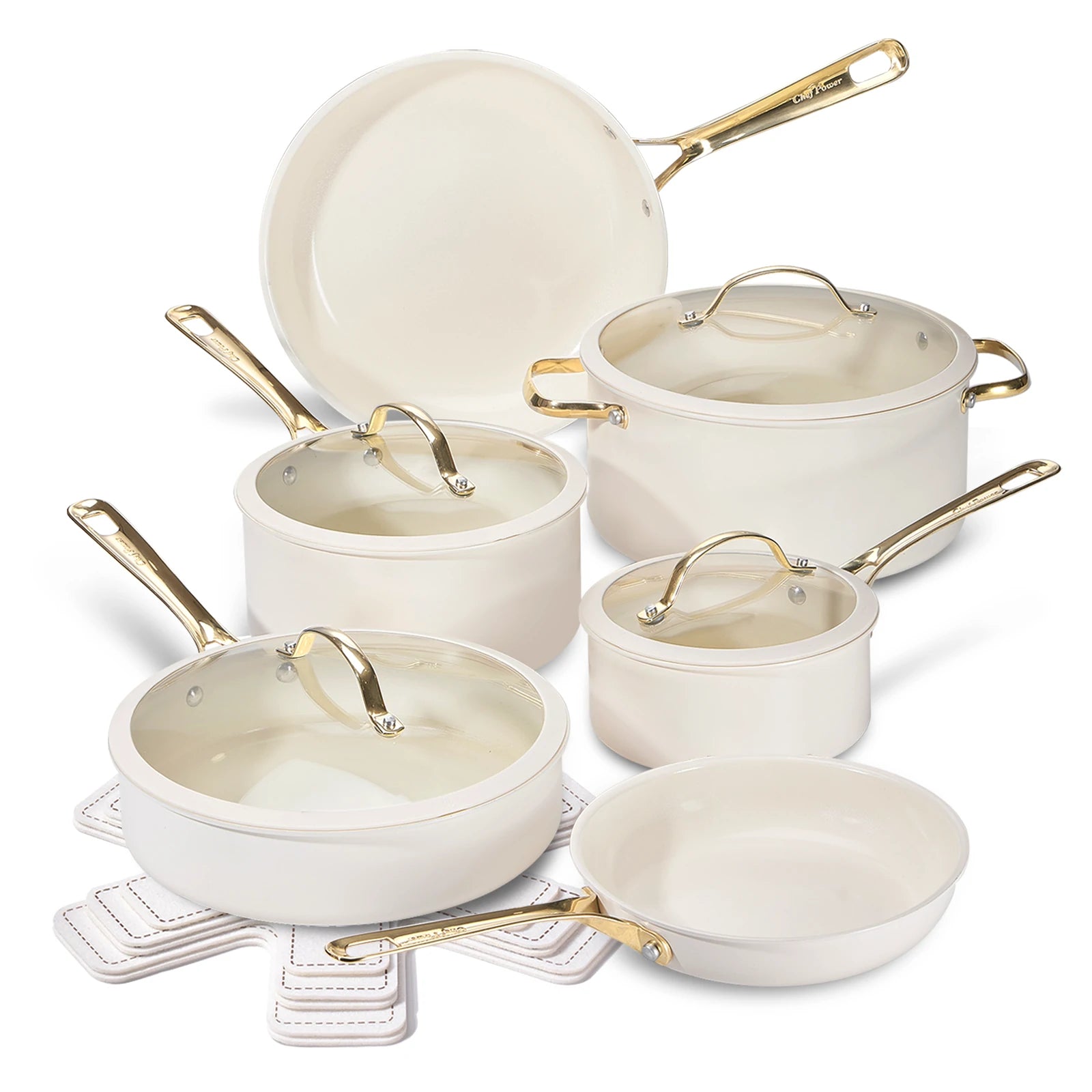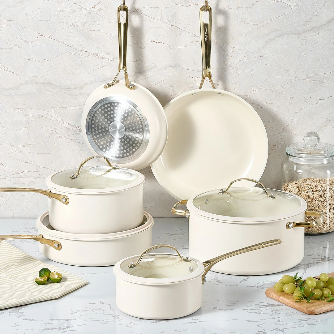 Stars Ceramic Nonstick 15-Piece Cookware Set with Light Golden Handles | Cream White