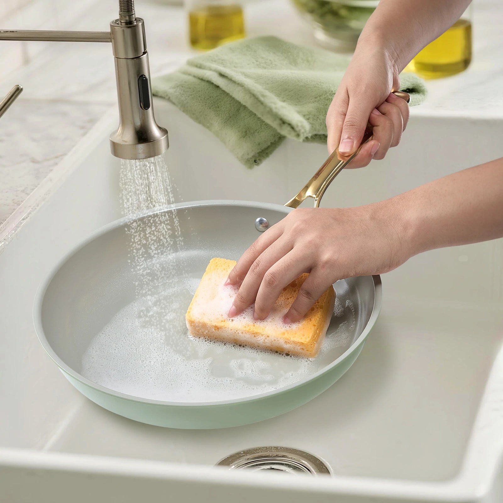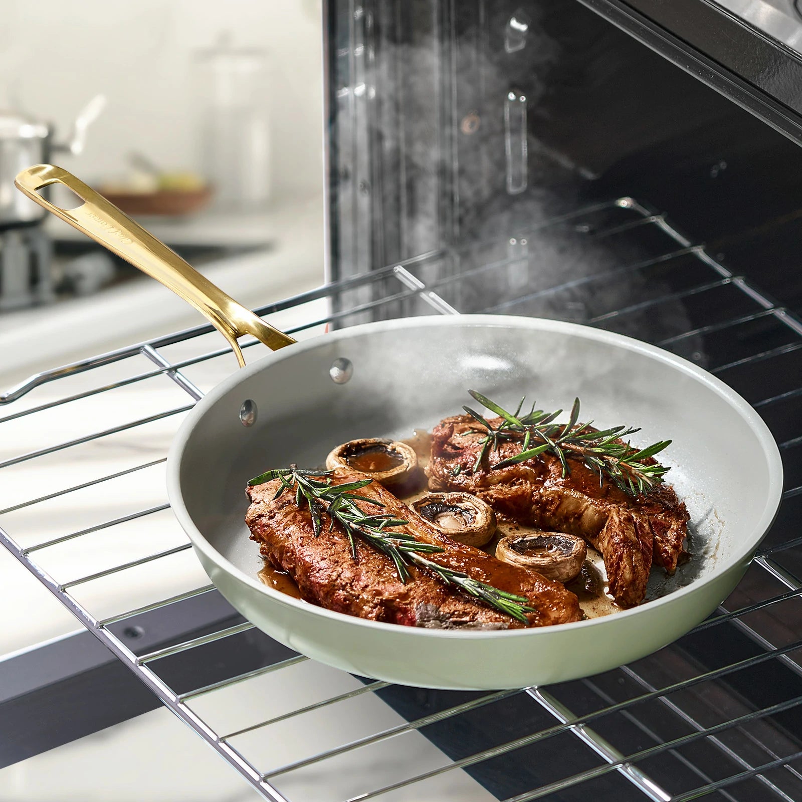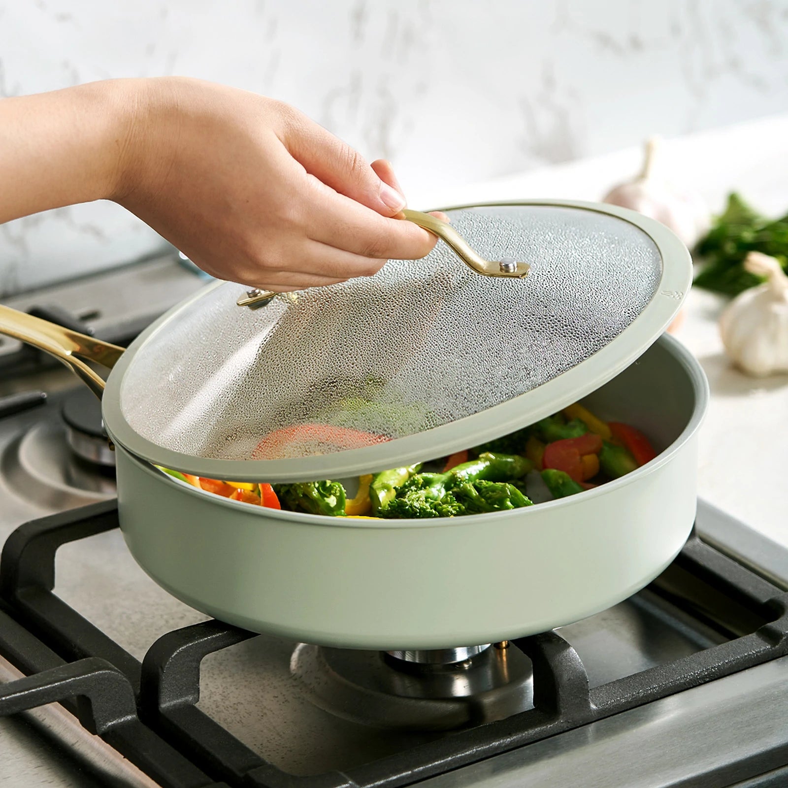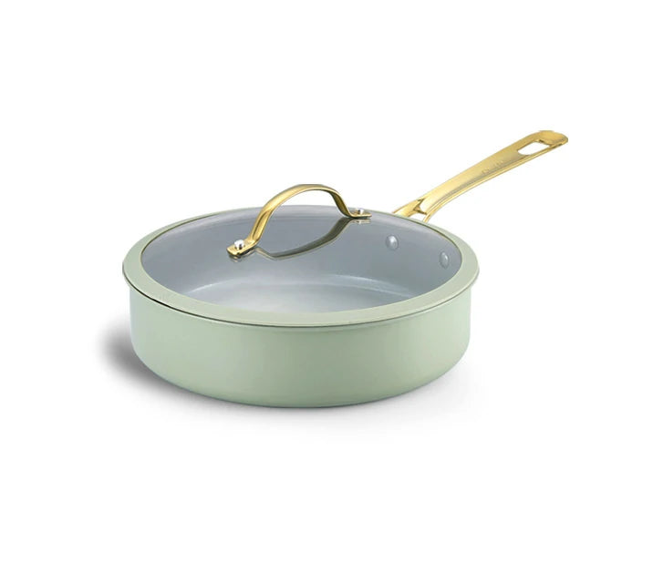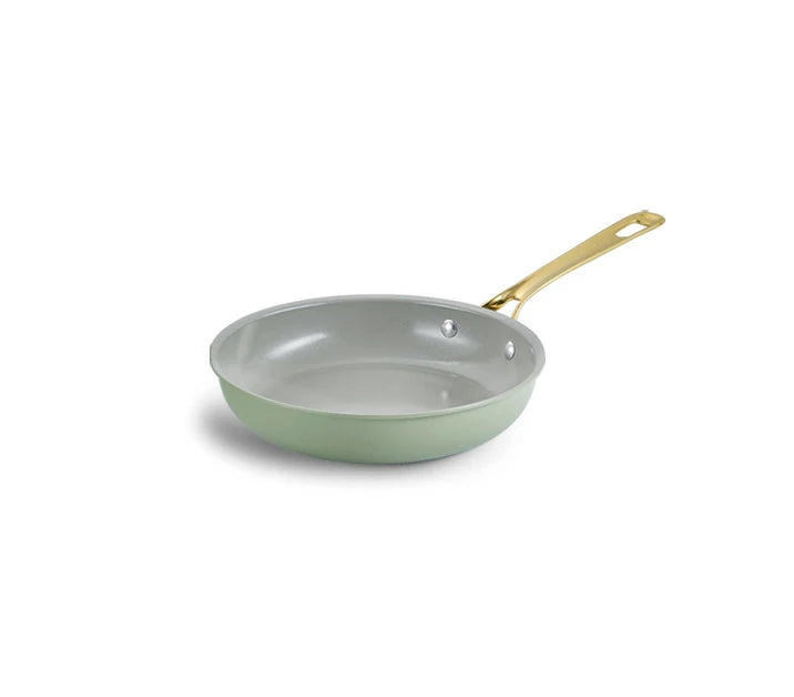 Built with a recycled aluminum core, a titanium-ceramic cooking surface, and an ergonomic handle in soft gold PVD stainless steel—where beauty meets everyday function.