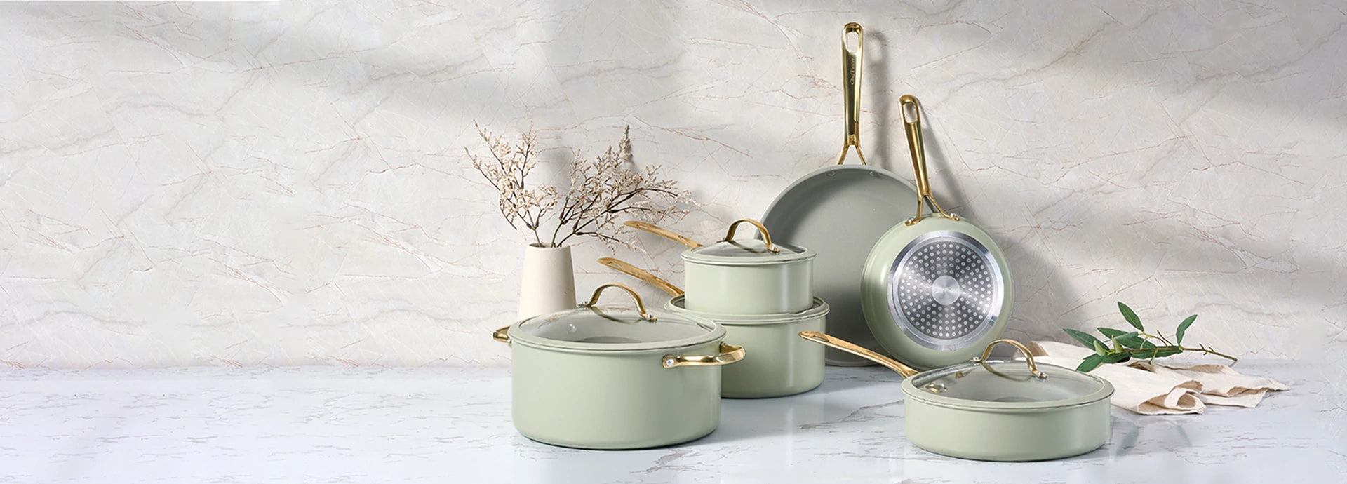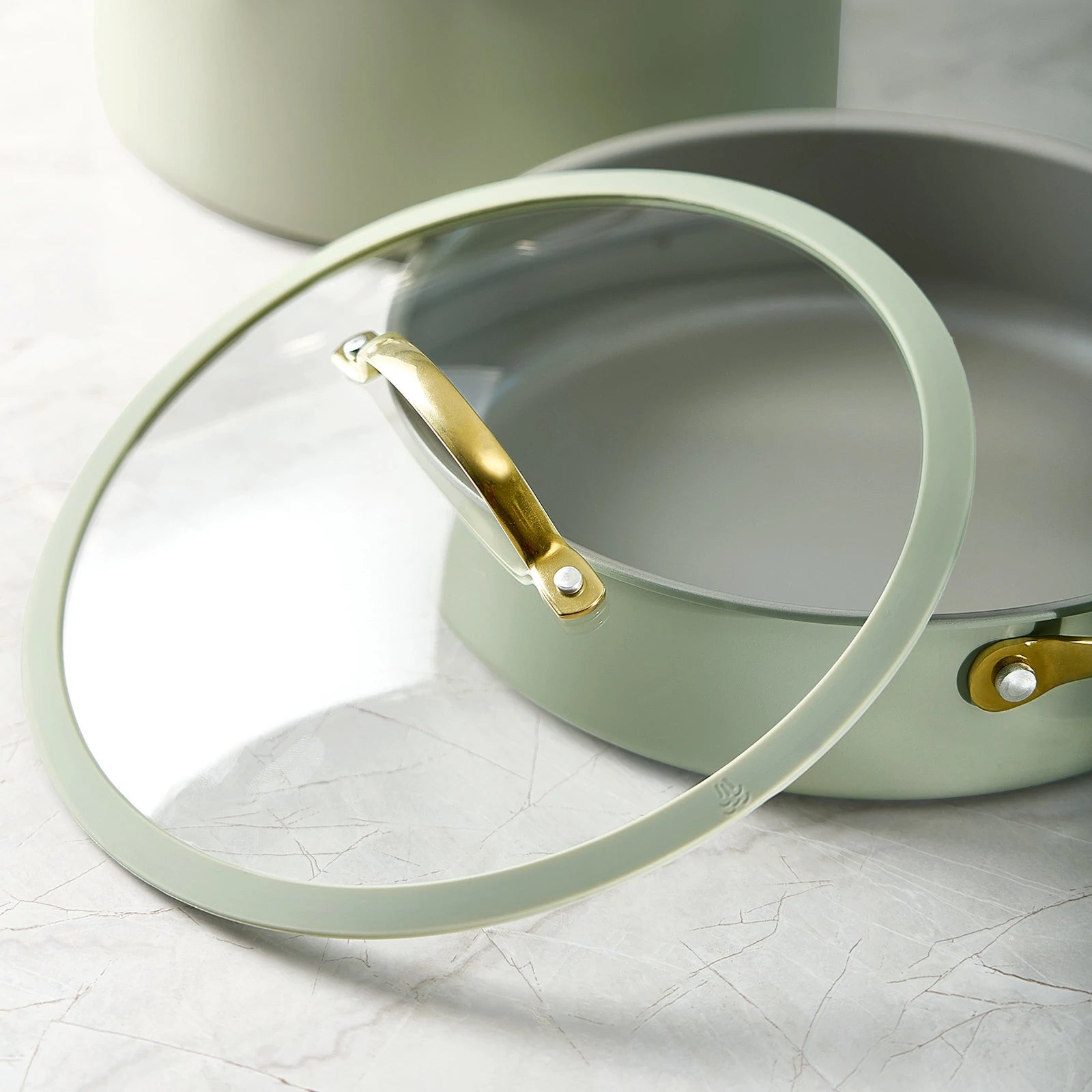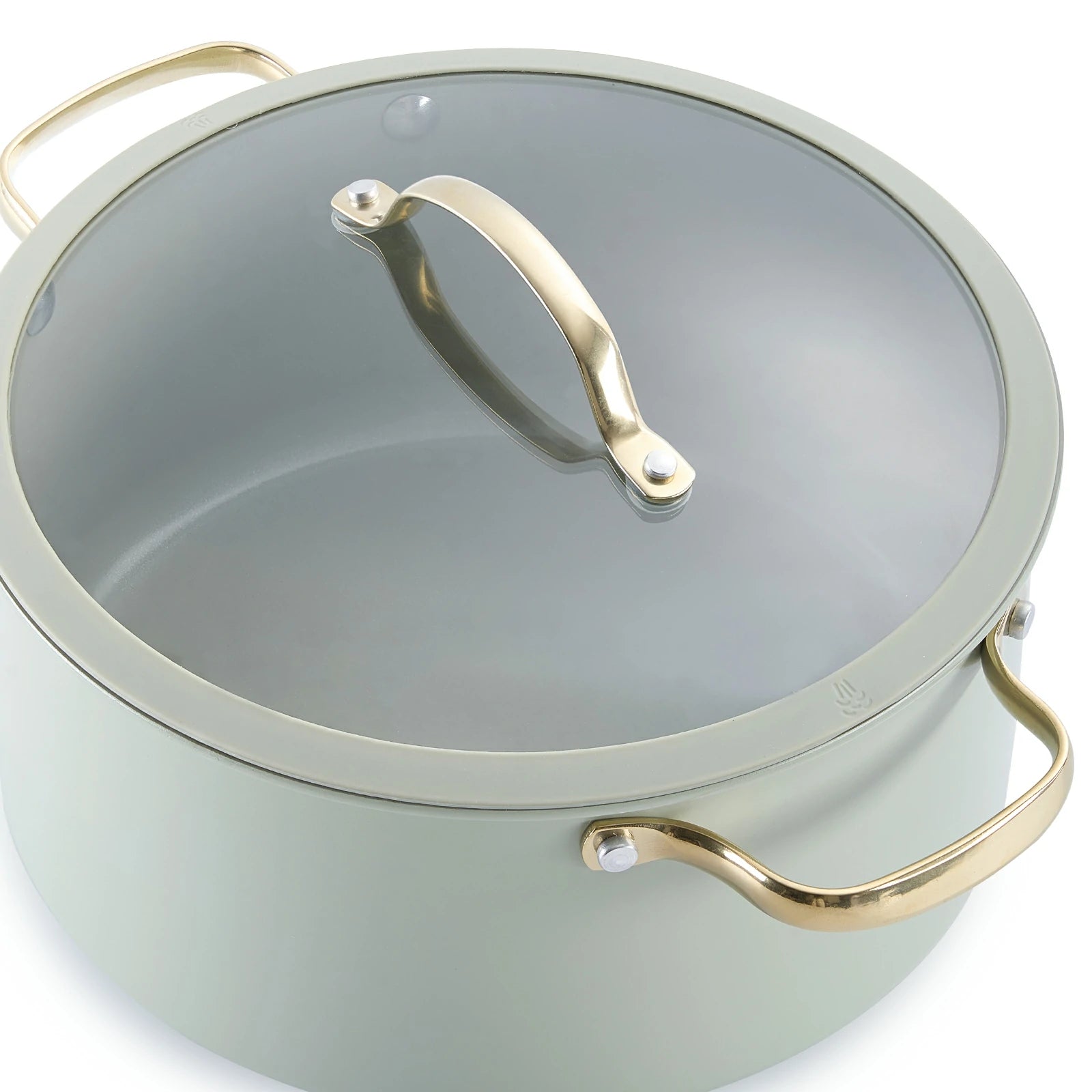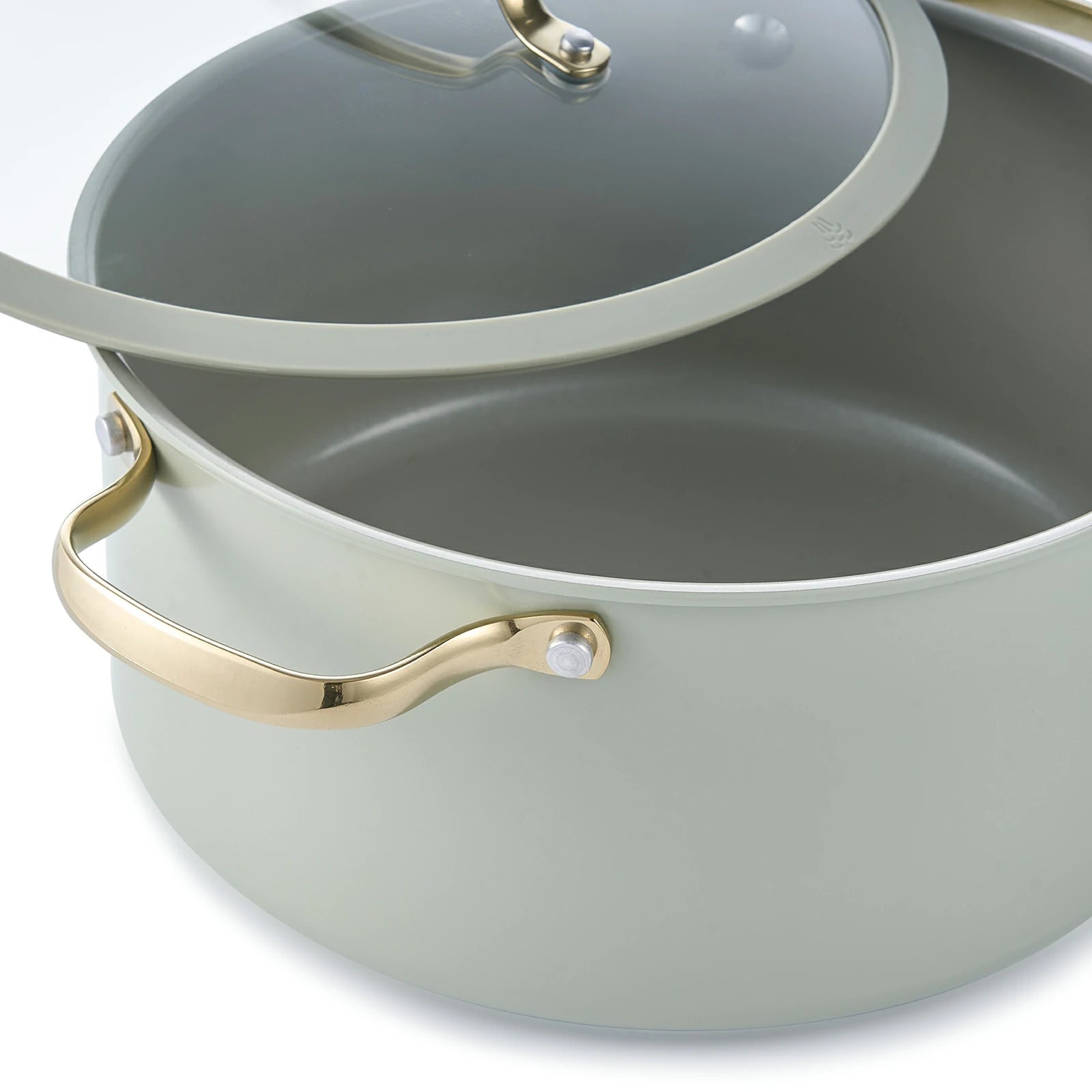 Stylish and safety cool-grip golden handles, angled for easy nesting, provides a secure, cool-touch hold.