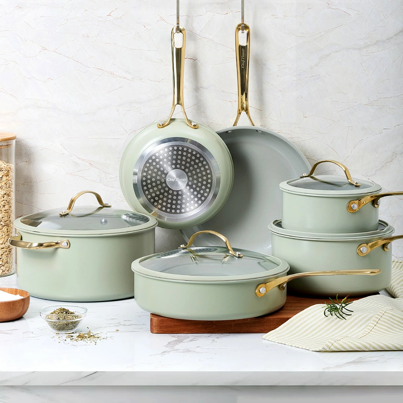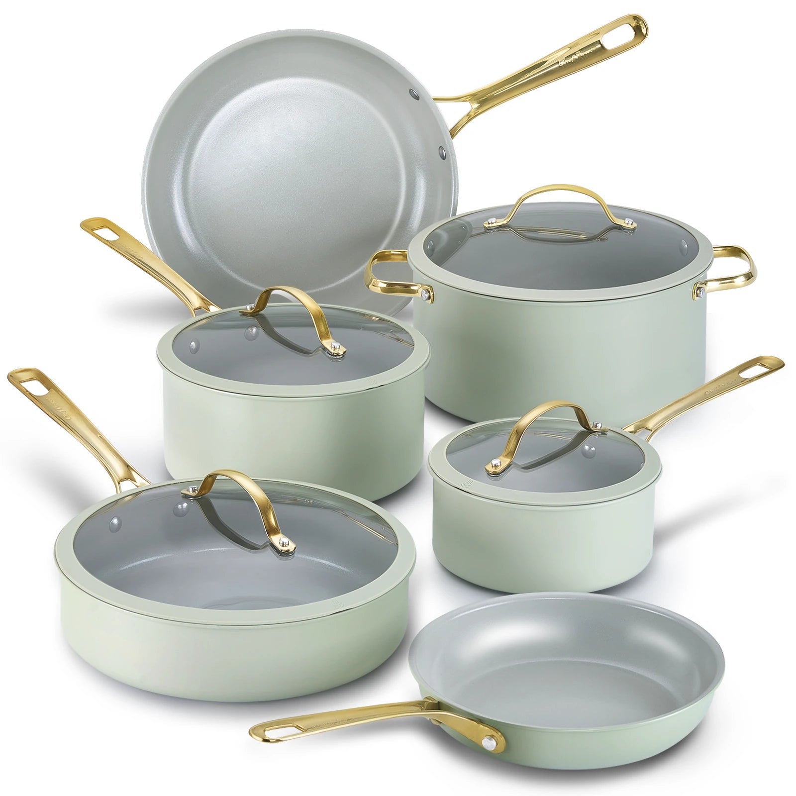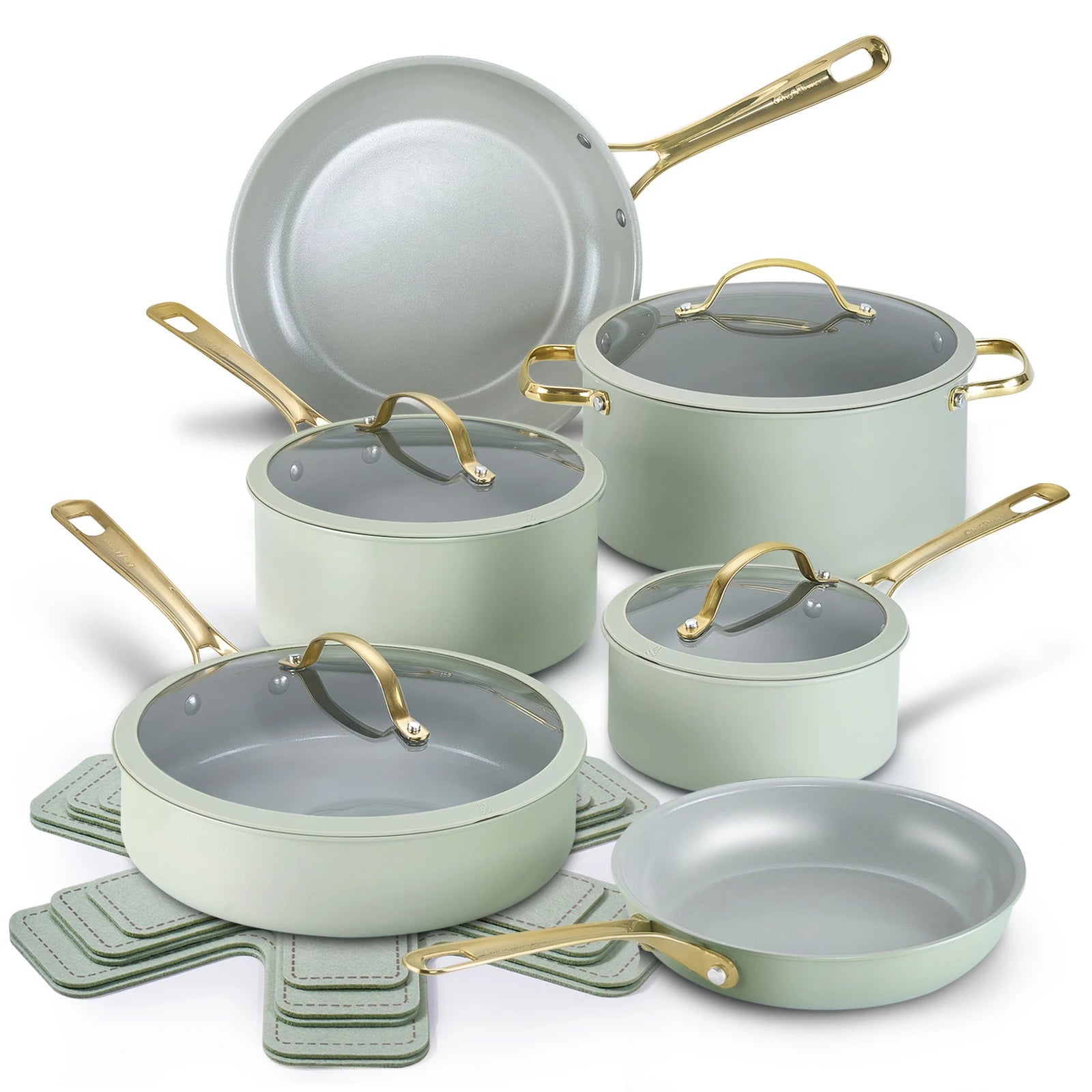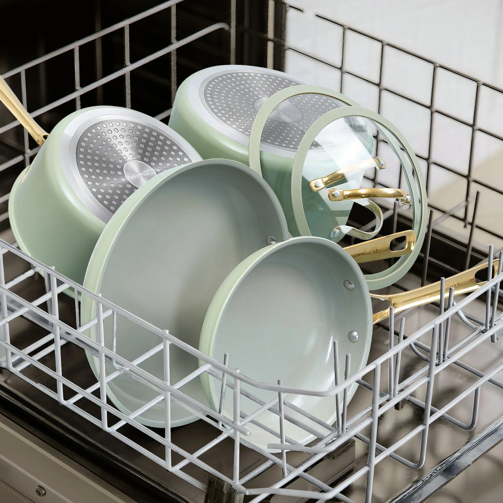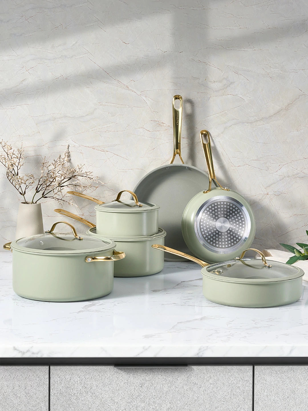 Stylish and safety cool-grip golden handles, angled for easy nesting, provides a secure, cool-touch hold.