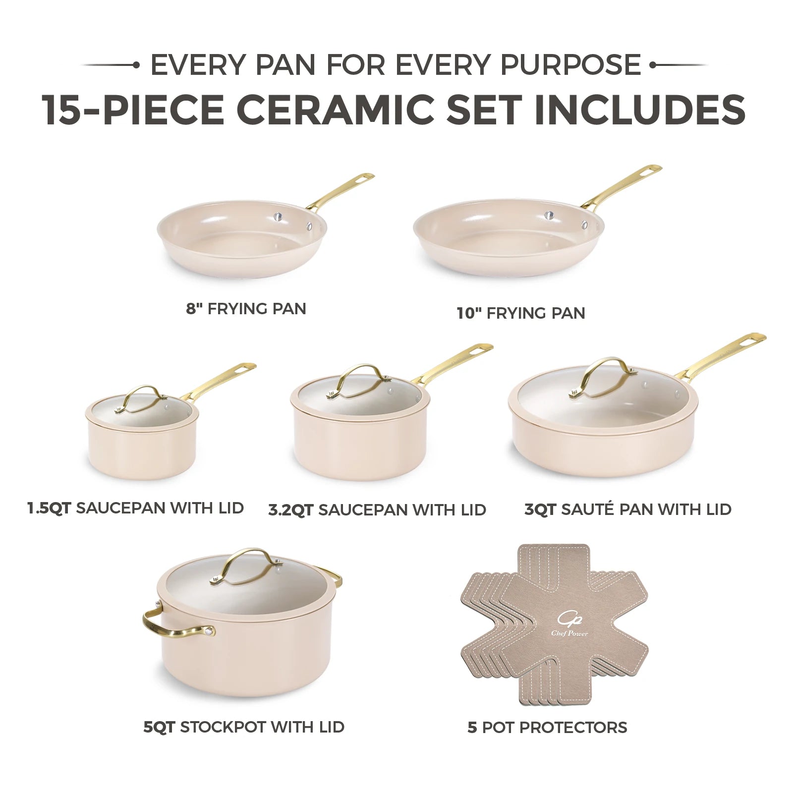 Stars Ceramic Nonstick 15-Piece Cookware Set with Light Golden Handles | Taupe