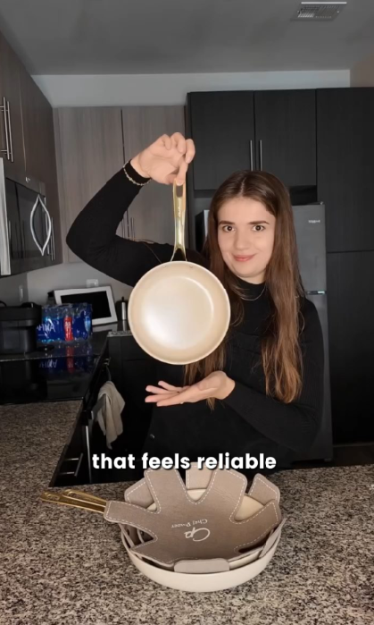 Built with a recycled aluminum core, a titanium-ceramic cooking surface, and an ergonomic handle in soft gold PVD stainless steel—where beauty meets everyday function.